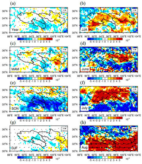 Differences between climatology of vertical water vapor (Vectors, kg/(m.s)) and its divergence (Shaded, kg/(m2.s)) in (a) annual average, (b) June-July-August (JJA) average, (c) March-April-May (MAM) average, (d) June average, (e) September-October-November (SON) average, (f) July average, (g) December-January-Februrary (DJF) average, and (h) August average from 2010 to 2019 and 2001 to 2010.
