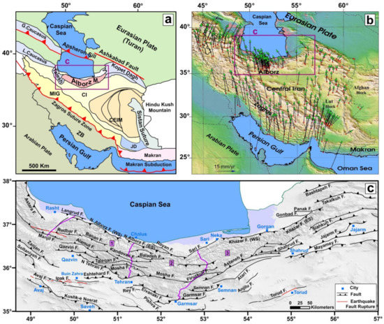 (a) The regional structure of Arabia-Eurasia collision, and the location of the understudy subzones (Alborz, Talesh, north of Central Iran; purple box) (ZB = Zagros Belt, MIG = Zone of Intruded Granitoides and Metamorphic Rocks, CEIM = Microcontinent of Central-East Iran, CI = Central Iran, and JD = Jazmurian Depression). (b) The GPS velocity field relative to the Eurasian reference frame [18,53]. (c) Active faults in the study area (the faults after [50,54,55]). Numbers 1, 2, and 3 are location of the West Alborz, Central Alborz, and East Alborz, respectively which are separated by purple lines.