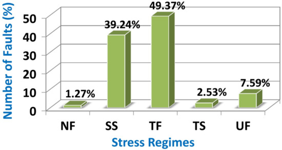 Regarding a normal tectonic regime, the obtained R′ is in the range of 0–1, while the values in the ranges of 1–2, and 2–3 are for strike-slip and thrust faulting tectonic regimes, respectively. Word Stress Map (WSM) standard was used for calculating stress regimes. TS, SS, NF, TF, NS, and UF symbols are thrust faulting with a strike-slip component, strike-slip faulting, normal faulting, thrust faulting, and normal faulting with a strike-slip component, as well as the unknown regimes, respectively. For each earthquake, these tectonic regimes are obtained based on the Zoback method [64] (Table 2).