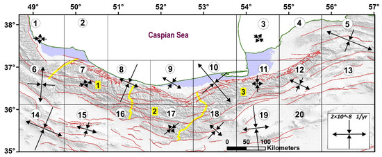 The direction and the magnitude of principal axes of SSR in the area. Labels within grids show grid number. Numbers 1, 2, and 3 are location of the West Alborz, Central Alborz, and East Alborz, respectively which are separated by yellow lines.