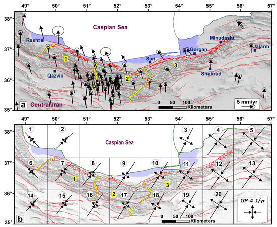 (a) The GPS velocity field with their error ellipses in the area which are relative to the Eurasian reference frame. (b) The principal axes of the geodetic strain rate obtained from the GPS velocities. Labels within grids show grid number. Numbers 1, 2, and 3 are location of the West Alborz, Central Alborz, and East Alborz, respectively which are separated by yellow lines.