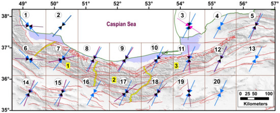 The compression directions of the principal axes resulted from the geodetic strain rates (blue), stress inversion (black), and seismic strain rates (purple). Labels within grids show grid number. Numbers 1, 2, and 3 are location of the West Alborz, Central Alborz, and East Alborz, respectively which are separated by yellow lines.