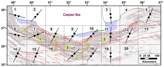 Destructive earthquakes in the Talesh-Alborz range, the South Caspian Basin, and the northern part of Central Iran indicate strong tectonic activity in the northern Iran region [6,7,8,9,10,11,12,13]. The region with a V-shaped geometry includes the main faults with NW-SE and NE-SW directions in its western and eastern parts, respectively. In these parts, the overall deformation style has been specified by a system of double-verging folds, left-lateral strike-slip, and reverse faults sub-parallel to the range trend [14,15].