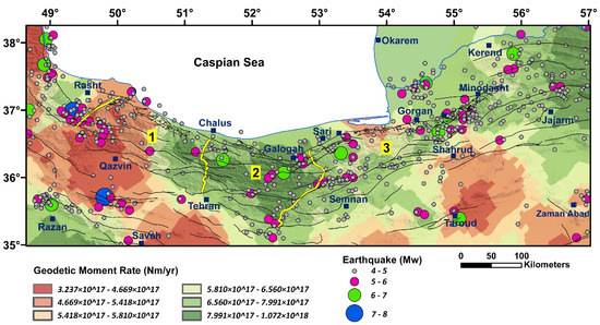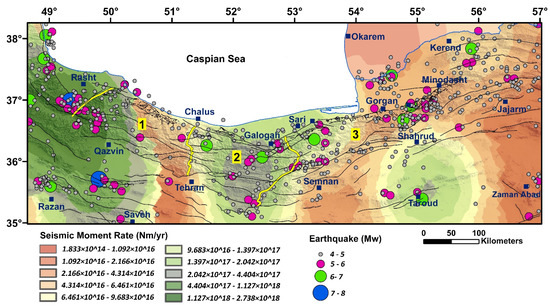 Zoning map of GMR with the distribution of the earthquakes (1900–2020). Numbers 1, 2, and 3 are location of the West Alborz, Central Alborz, and East Alborz, respectively which are separated by yellow lines.