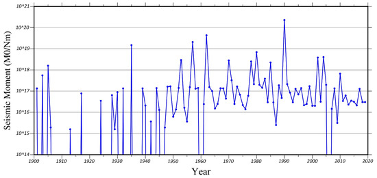 SMR only measures the deformation accommodated by faulting [1]. To estimate it in different parts of the area, all of the earthquakes that occurred from 1900 to 2020 are displayed in Figure 9. Based on the magnitude of earthquakes, the amount of seismic moment for each earthquake is calculated (Equation (12)).