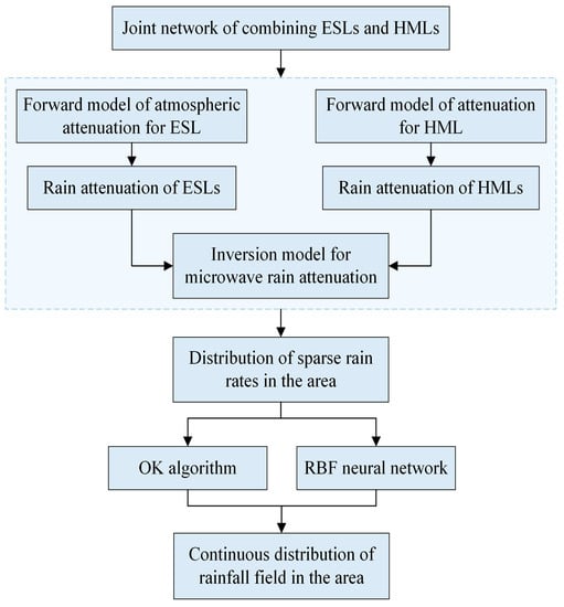 Microwave signals will have significant attenuation due to scattering and absorption of rainfall. This physical phenomenon can lead to serious rain attenuation of the radio wave signals from communication satellites to the earth and the communication links between ground-based communication base stations due to rainfall. The ingenuity of the new technique of retrieving rainfall by using rain attenuation from ESL and HML is to reverse the interference of rainfall in the atmosphere to microwave signals to obtain rainfall information. In addition, ESLs and HMLs can be combined to retrieve rainfall field when multiple ESLs and HMLs are present in the area. Figure 1 depicts the process of retrieving rainfall field by combining ESLs and HMLs. Firstly, a link network for rainfall observation can be built by a combination of ESLs and HMLs in the area. Then, the sparse rain attenuation at the location of the link network can be obtained by using the forward model of rain attenuation for ESL and HML. Furthermore, the inversion model of microwave rain attenuation can be used to convert the rain attenuation into sparsely distributed rain rates in the area. Finally, the spatial reconstruction method can be used to obtain the continuously distributed rainfall field.