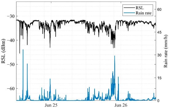 To visualize the correspondence between the HML signal and the rain rate, we used the HML (26 GHz, vertical polarization) set up in Jiangyin, China, to realistically record the RSL of its receiver during rainfall. Additionally, a rainfall event in June 2021 is selected to validate the correlation between RSL and rain rate as shown in Figure 3. Similar to the ESL signal, the HML signal intensity decreases significantly in the presence of rainfall. This phenomenon becomes more obvious as the rain rate increases. In addition, rainfall is the most powerful factor in the variation of the HML signal. Additionally, the CC between RSL and rain intensity was calculated to be −0.762 by further analysis. The strong correlation indicates that the HML signal is highly sensitive to rain rate and is more suitable for retrieving rainfall.