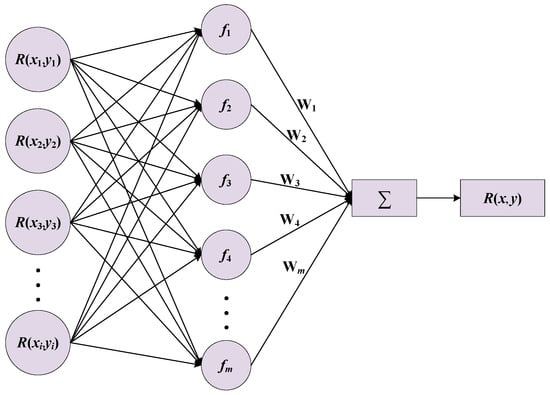 For the reconstruction of rainfall field in the area, the rainfall, at a point in space, has the highest correlation with the nearest rainfall to it. Additionally, this distribution, characteristic of the rainfall field, coincides with the local approximation feature of the RBF neural network. Therefore, we can design the RBF neural network to reconstruct the rainfall field as shown in Figure 4. The geometric meaning is that a continuous two-dimensional rainfall field R(x, y) is recovered from the sparsely distributed rain rates R(xi, yi) retrieved from the ESLs and HMLs. The specific reconstruction function can be expressed as