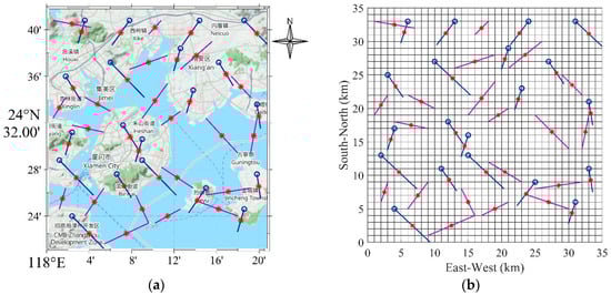 Network distribution of ESLs and HMLs in Xiamen: (a) Distribution of the original link network; (b) Distribution of the link network in the gridded area. The blue lines represent the ESLs, the blue markers “o” indicate the location of the satellite antennas, the purple lines represent the HMLs, and the red markers “*” indicate the midpoint of the links.