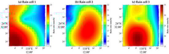 To test the performance of rain cell retrieval by the network of ESLs and HMLs, we first designed various kinds of different rain cell samples in the experimental area as the initial rainfall fields according to the HYCELL model. The rain cells consist of 1225 (35 × 35) rain rate signals and thus have a spatial resolution of 1 × 1 km2. Then, the sparsely distributed rain cells in the experimental area are retrieved by the joint network of ESLs and HMLs. Finally, the OK algorithm and RBF neural network are used to reconstruct the sparse rain cells, respectively, so as to obtain the complete rain cells in the experimental area. For the RBF neural network, we simulate 100 different rain cells as the training set according to the parameter range in Table 2, so as to determine the parameters of the neural network model. In addition, in order to verify the performance of OK algorithm and RBF neural network for reconstructing rain cells, a set of different rain cells consisting of three rain cells were designed as the validation samples of rainfall field, and their spatial distribution of rainfall is shown in Figure 6. There are significant differences in the range of rain rates and the location of peak rainfall between these rain cells.