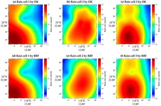 The results of the joint network of ESLs and HMLs retrieving the set of different rain cells. (a–c) represent the rain cells reconstructed by the OK algorithm, and (d–f) represent the rain cells reconstructed by RBF neural network.