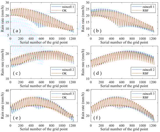 The results of joint net of ESLs and HMLs retrieving the rain rates of the different rain cells. (a,c,e) are the rain rates of the different rain cells retrieved by the OK algorithm, and (b,d,f) are the rain rates of the different rain cells retrieved by the RBF neural network.