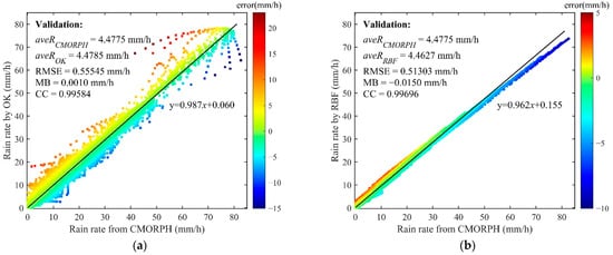 The results of the joint network of ESLs and HMLs retrieving all rain rates from 300 real rainfall fields are shown in Figure 9. From the validation in Figure 9a, it can be seen that the RMSE and CC between the results retrieved from the network of ESLs and HMLs based on the OK algorithm and the rain rates of real rainfall fields are approximately 0.56 mm/h and 0.996, respectively, and the average rain rate retrieved is very close to that of real rainfall fields. In addition, from the validation in Figure 9b it, can be shown that the RMSE and CC between the results retrieved from the network of ESLs and HMLs based on RBF neural networks and the rain rates of the real rainfall fields are about 0.51 mm/h and 0.997, respectively, and the average rain rate retrieved is significantly lower than that of the real rainfall fields, which is more obvious during heavy rainfall. The retrieval results of the OK algorithm and the RBF neural network are generally unbiased, as evidenced by the MB, but the RMSE and CC of the RBF neural network for retrieving the rain rates of rainfall fields are better than the retrieval results of the OK algorithm. However, the performance of the RBF neural network in retrieving the average rain rate of the real rainfall fields is not as good as that of the OK algorithm. In general, the results of the OK algorithm retrieval have a few results with large errors across the range of rain rates. This is directly reflected in the fact that some of the data points deviate from the fitting straight line for all ranges of rain rates retrieved by the OK algorithm in Figure 9a. In addition, the results retrieved by the RBF neural network are in overall better agreement with the rain rates of the real rainfall fields than those retrieved by the OK algorithm, as can be seen in Figure 9. However, the rain rates over 50 mm/h retrieved by the RBF neural network are lower than those of the real rainfall field in Figure 9b, which shows that the RBF neural network underestimates the rain rates for retrieving extreme rainfall (over 50 mm/h).