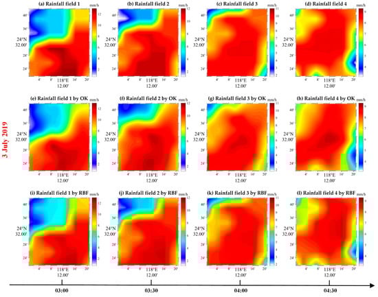 The results of retrieving stratiform rainfall event that occurred on 3 July 2019 by combining ESLs and HMLs. Rainfall field 1 to rainfall field 4 in (a–d) show the development of the stratiform rainfall at 0.5 h intervals, characterized by small rain rate, long duration and slow movement. (e–h) are the results of retrieving the stratiform rainfall from rainfall field 1 to rainfall field 4 by the OK algorithm, and (i–l) are the results of retrieving the stratiform rainfall from rainfall field 1 to rainfall field 4 by the RBF neural network.