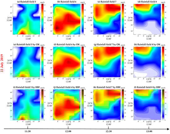 The results of retrieving convective rainfall event that occurred on 22 July 2019 by combining ESLs and HMLs. Rainfall field 5 to rainfall field 8 in (a–d) show the development of the convective rainfall with a high peak of rain rate, rapid development and fast movement of the rain cluster. (e–h) are the results of retrieving the convective rainfall from rainfall field 5 to rainfall field 8 by the OK algorithm, and (i–l) are the results of retrieving the convective rainfall from rainfall field 5 to rainfall field 8 by the RBF neural network.