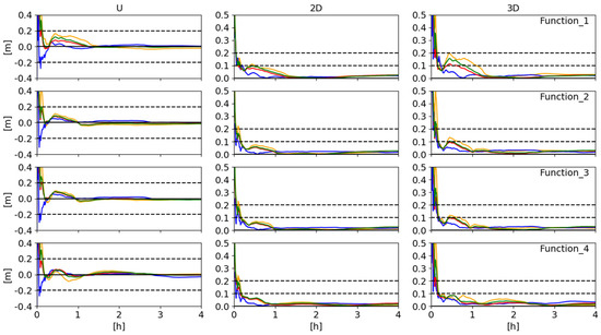 Time series of U component, 2D and 3D errors for the first four hours for the weighting functions. Functions 1–4 for the MAS100ESP station for the 39 DoY for all solutions. Blue—E solution, orange—G solution, red—GE solution, green—GE1 solution.