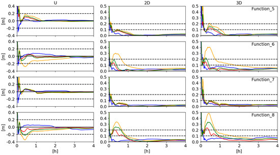 In this study, the convergence time is described as the time when the station position reaches an accuracy of 20 cm and does not exceed this level thereafter. Figure 4 and Figure 5 present the time series of the first four hours for the Up component, horizontal (2D) and spatial (3D) errors for all analyzed weighting functions. The strong dependence of the error on used weighting functions is noticeable, especially for the first epochs. Moreover, the errors for the G and E have different behavior. For the E, the best results were obtained for Function_3, with 5 mm, 22 mm and 25 mm accuracy for the U component, 2D and 3D errors, respectively, whereas for the G, the best results were obtained for Function_7, with values of −1 mm, 10 mm and 16 mm, respectively. The shortest convergence time of 14 min was obtained for Function_8 for the E and 19 min was obtained for Function_7 for the G. In addition, for G, the slightly longer times were also obtained for Function_1, Function_2, Function_3 and Function_4. For the GE, the best results were obtained for Function_2, with 3 mm, 12 mm and 15 mm, respectively, and similarly for the GE1, with an accuracy of 3 mm, 13 mm and 16 mm, respectively. The best convergence time was obtained for Function_6, with 13 min for the GE, and for Function_1, Function_2 and Function_7, with 18 min for the GE1. For all cases, the GE1, where lower precision for Galileo observations was adopted, had worse results than the GE.
