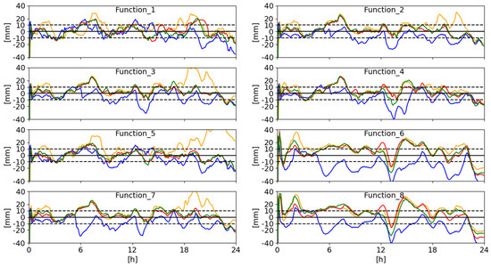 Significantly larger errors were obtained for the Up component. The positive values were always obtained for the E, whereas only the negative were for the G. A bias between the E and G was noted for all weighting functions. As shown in [69], using GPS receiver antenna phase center corrections for Galileo observations causes a bias of almost −8 mm for the Up component. In our solutions, the bias depends on the function used and varies from 7 mm for Function_1 to 38 mm for Function_6. A significant difference was also spotted for Function_8, at a value of 33 mm. For the remaining functions, they ranged between 10 and 20 mm. The standard deviation amounts were 10 mm for both the G and E. The best results, i.e., ±4 mm and ±8 mm for the G and E respectively, were obtained for Function_2 and Function_7. Much greater standard deviation was obtained for Function_4 for the G, which was ±16 mm. For the GE and GE1, better results were obtained than for the G and E, where the mean values were less than 7 mm, except for Function_6 and Function_8, for which the error values of −13 mm and −11 mm were obtained for the GE1. Standard deviation for the GE and GE1 was less than 5 mm for all functions.