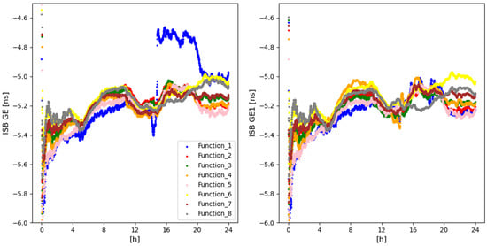According to [75,76], the ISB parameter must be estimated for multi-GNSS positioning. ISB can be estimated as a constant value or as a time-varying value [67] and should have the same value regardless of the weighting functions. In our analysis, we estimated ISB as a random walk process. Figure 7 shows the estimated ISB for the analyzed GPS+Galileo solutions, where one can see the differences depending on the solution and the function used. For Function_1, for the GE, a big jump of around 14 h:30 min was observed. The difference for ISB was from −5.2 ns to −4.8 ns (about 11 cm), which did not occur for the GE1. For Function_6 (yellow) and Function_8 (gray) in the GE solution, a much worse consistency with the other weight functions was obtained after 19 h. The systematic difference was about 0.2 ns (6 cm). Changing the weights for the Galileo observations in the GE1 solution helped to remove this difference for Function_8, but, unfortunately, a discrepancy appeared between 15 h and 18 h. The other functions show a generally high consistency, in the range of 0.1 ns, which corresponds to less than 3 cm.