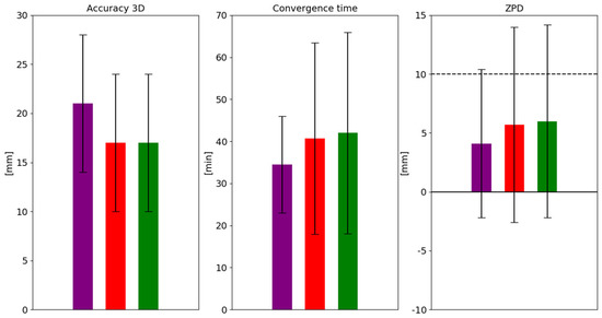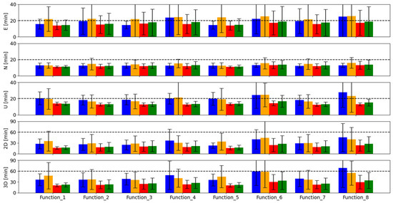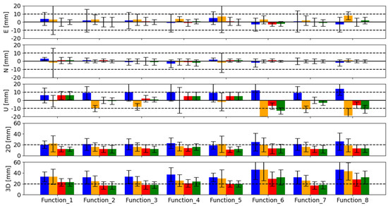 Regarding the analysis for the 3D error, lower values were obtained for the G than for the E. The accuracy for the G amounted 25–33 mm with a standard deviation of approximately 10 mm, except for Function_6 and Function_8, for which the values of 43 mm and 46 mm were obtained with a standard deviation of 20 mm and 16 mm, respectively. The best values were obtained for Function_3, i.e., 26 ± 9 mm. For the E, the error values ranged from 32–37, mm with a standard deviation of approximately 10 mm. Again, the worst results were obtained for Function_6 and Function_8, with 46 ± 18 mm. On the other hand, the best results were obtained for Function_5, i.e., 32 ± 8 mm. For the GE and GE1, better results were obtained than for the G and E. The error values ranged from 17–23 mm wit standard deviations of 6–8 mm. Additionally, for these solutions, the worst values were obtained for Function_6 and Function_8. In case of the GE1, they amounted to 32 ± 14 mm and 32 ± 12 mm, whereas for the GE, they amounted to 29 ± 13 mm and 28 ± 12 mm. The best values for both solutions were obtained for Function_2 17 ± 7 mm.