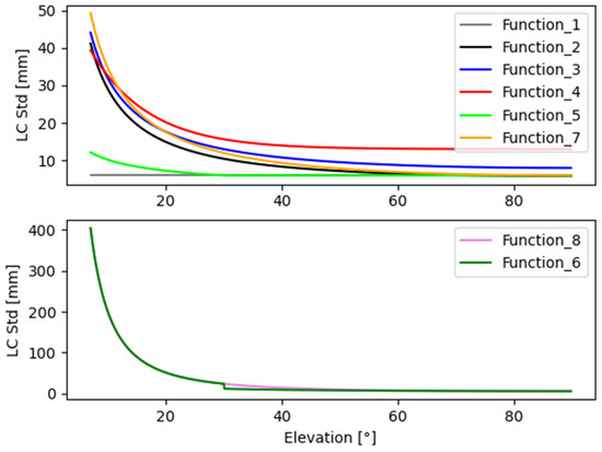 Most of the existing software and studies use the trigonometric functions for weighting observations [58]. In this analysis, the seven weighting functions presented in Table 2 were chosen. First, the model where all observations have the same precision, without a function (hereinafter referred to as Function_1) was chosen. For all other cases, the precision of observations depends on the elevation angle. Function_2 was taken from AC MIT (GAMIT software) [59] and Function_3 from AC National Geodetic Survey (NGS) [58]. Function_4 is adopted from work [60]. Another way to weight observations is to use the threshold value of elevation angle, for example 30°, and to use different functions below and above this angle (Function_5 and Function_6), as was shown in works [11,32]. The final two functions are basic functions: the simple sine function (Function_7) [61] and square sine function (Function_8) [62]. All these weighting functions were implemented in the PPPH software used.