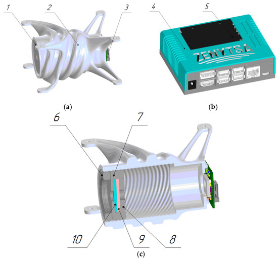 The design of the harmonic-lens-based video camera for the small satellite 3U CubeSat: (a) a 3D model of the video camera; (b) the exterior of the computing unit (3D model); (c) the video camera in section view (3D model). 1—lens unit; 2—casing; 3—CMOS sensor; 4—processor casing; 5—Jetson Nano processor; 6—locknut; 7—a mount for the lens and IR filter; 8—a nut; 9—an IR filter; 10—harmonic lens.