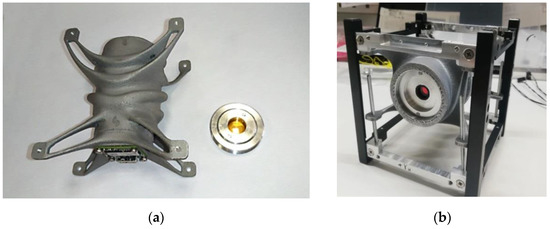 (a) The diffractive lens and 3D-printed camera casing and (b) CubeSat frame with the mounted camera.