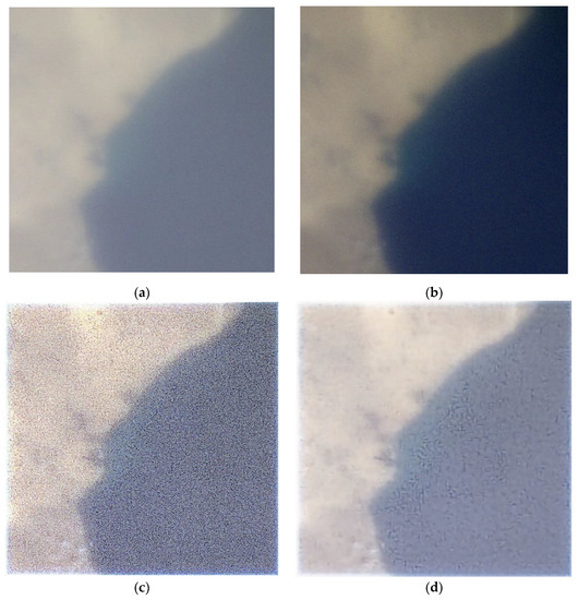 Due to a satellite platform limitation described in Section 2, we used the Basler daA1600-60uc (USB 2.0) (Mannheim, Germany) onboard our satellite. The high level of gain = 4 we used for this image sensor produces significant imaging noise, as shown in Figure 6a.