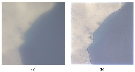 To deal with the camera sensor noise, we applied a denoising algorithm in the dark areas of the input image to compensate for the reconstruction artifacts. An optimal denoising result was achieved by the algorithm from [53] with the regularization parameter of 0.2 and iteration count of 1200. We obtained the segmentation mask using a threshold processing algorithm to apply the denoising algorithm to the dark part of the input image (water) as shown in Figure 8a. The lossy CNN model was then applied to the denoised image, with the result shown in Figure 9. One may see a higher quality of the water area as the artifacts became less noticeable. More examples of the reconstructed images captured with our HDL in the nanosatellite are shown in Figure A3 in Appendix A.