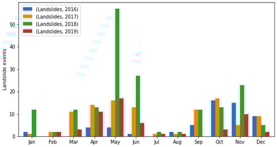 Figure 1 below shows landslide events occurring between 2016 and 2019 as listed in these inventories. A bimodal annual pattern of landslide occurrence is observed in the data, with two maximum peaks in May and October-November, reflecting the strong influence of rainfall on landslide occurrence.
