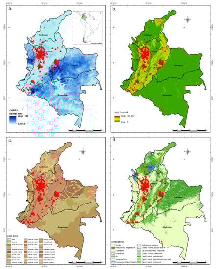 Datasets used for the study area and corresponding landslide events happening between 2016 and 2019: (a) CHIRPS rainfall (mm)—used in the logistic model and LTF method; (b) slope angle derived from SRTM V3—used in the logistic model and LTF method. (c) USDA Soils Classification—used in the logistic model; (d) Copernicus Landcover 2019—used in the logistic model.