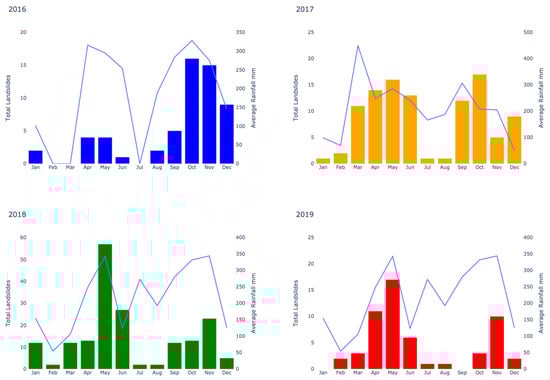 Monthly rainfall-triggered landslide events during the study period 2016–1019 and monthly cumulative rainfall data for the same timeframe from CHIRPS.