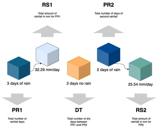 An example of rainfall characteristics for two successive rainfall/dry periods at one landslide location. PR1 and RS1 represent the very first rainfall recorded at one location: (PR1) number of days that the rainfall (intermittently lasted) and (RS1) the total amount of rainfall in that period. Then, there was no rain for 2 days (DT), but later it rained for 2 extra days (PR2) amounting to the triggering rainfall (RS2). These rainfall/dry pairs start at the beginning of the rainfall time series (01/01/2016) until the time of the landslide as listed in the inventory. Each pair is stored as a “running” data line where PR2 and RS2 become PR1 and RS1 of the following line.