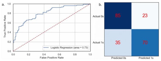 Validation results of the logistic regression demonstrate that the model can correctly predict 73% of the cases using the newly created dynamic variables. Figure 5a shows the ROC curve that helps summarize the model predictability based on the area under the curve (AUC). The AUC reflects the probability that a randomly chosen actual landslide incident will have a high chance of classification as being an actual event. The model has an AUC of 0.73, suggesting good data-driven predictability for landslide events. Figure 5b shows the confusion matrix for the model. These values help explain the precision (true positive)/(true positive + false positive), recall (true positive)/(true positive + false negative), and F1-measure, which combines the precision and recall. These measurements can be seen in Table 5 below.