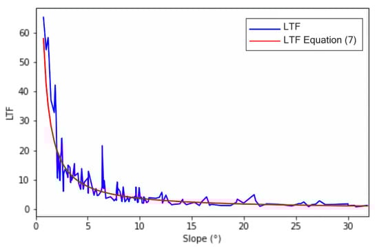 where the determination coefficient (R2) for the LTF threshold-Slope relationship as per Equation (7) is R2 = 0.836. Figure 6 shows that the LTF-Slope angle relation rapidly changes in smaller slope angles, whereas it barely fluctuates in larger ones. Slopes greater than 25° show an asymptote average threshold value of 1.227 with a standard deviation of 0.104.