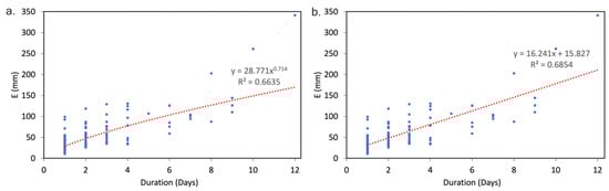 where E is the cumulative rain in (mm); D is the rainfall period expressed hourly or daily; α is the slope of the fitted line; and where C represents the y-intercept [49].