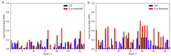 Figure 8a,b below show the E-D and LTF threshold FPR values for the training and testing datasets. In both cases, the LTF threshold performs better than the E-D threshold for 71% and 81% of the cases, respectively.