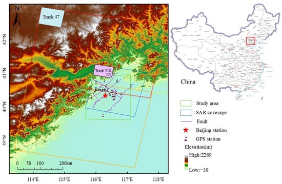 Beijing is located in northern China and north of the North China Plain, ad-jacent to Tianjin in the east and Hebei in the west. It has a total area of 16,412 km2. The elevation of Beijing is high in the northwest and low in the southeast, with an average elevation of 43.5 m. Beijing is surrounded by mountains in the west, north and northeast, whereas the southeast region comprises a plain gradually sloping towards the Bohai Sea. Figure 1 shows the geographical location of Beijing. The depressions in the Beijing plain area are loose sediments with thicknesses of more than 1000 m, which are prone to ground fractures and land subsidence [36].