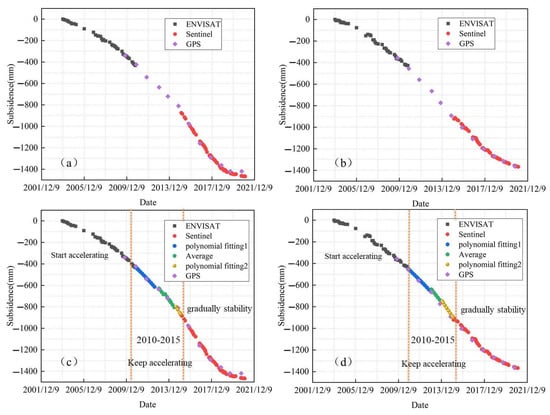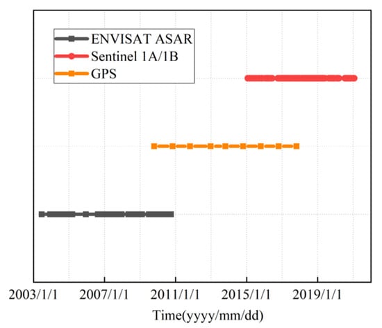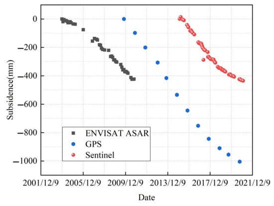 While processing ENVISAT ASAR and Sentinel-1A/1B data using SBAS-InSAR technology, selecting the same coordinates of unwrapped reference points of the two datasets is necessary. The specific operational process for processing involves transforming the same selected geographical coordinates into phase coordinates. Due to the deformation information captured by ENVISAT and Sentinel in different spatial regions, it was necessary to extract overlapping regions of the two datasets. To obtain a development trend of land subsidence over the period 2003 to 2020, we projected LOS direction deformation from different sensors to the vertical direction and geocoded them in the same geographic coordinate system. By using continuous GPS measurement and quadratic polynomial interpolation, we referenced two measurement data to the same location and corrected the offset in time to obtain GPS and InSAR observation data in the same temporal and spatial reference frame.