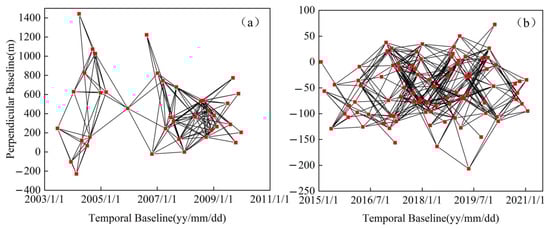Temporal and perpendicular baseline maps of (a) ENVISAT ASAR and (b) Sentinel-1A/1B.