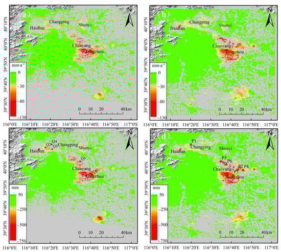 Deformation results of land subsidence along the LOS in Beijing during 2003–2010 and 2015–2020. Mean deformation velocity during 2003–2010 (a) and 2015–2020 (b). Cumulative deformation during 2003–2010 (c) and 2015–2020 (d). Note: Q1–Q6 (c) and P1–P6 (d) represent the extracted deformation feature points in typical subsidence area. The black marks in the figure are mainly deformation zones. The colored dots from green to red represent InSAR values.