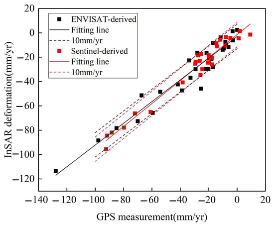 Correlation between GPS measurements and annual LOS deformation results of InSAR. Black scatter points are the ENVISAT-derived results, and black straight line is the line fitted by ENVISAT-derived results and GPS. Red scatter points are the sentinel-derived results, and red straight line is the line fitted by sentinel-derived results and GPS.