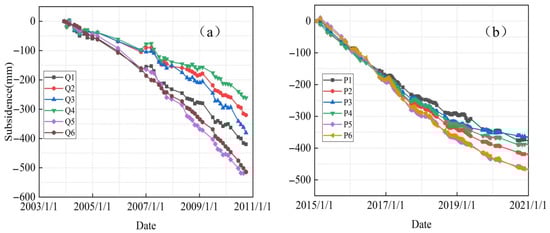 The time-series of the extracted feature points during 2003–2010 and 2015–2020 showed nonlinear subsidence at different velocities (Figure 6). From 2003 to 2010 (Figure 6a), land subsidence along the LOS in Beijing continued to increase, and its land deformation rate also increased, with the maximum accumulative deformation amount reaching −514 mm. The deformation was relatively small from 2003 to 2005. After 2006, the amount of land subsidence in Beijing increased gradually. Further, five observed deformation funnels expanded over approximately seven years in scale and number. The largest settlement center was located in Chaoyang. In addition, the time-series deformation diagram (Figure A1 in Appendix A) further demonstrates the formation process of settlement funnels from 2003 to 2010. From 2015 to 2020 (Figure 6b), land subsidence continued to increase. The subsidence in Chaoyang was the most severe, with the maximum accumulative deformation reaching −472 mm. The deformation changed slightly from 2015 to 2016, and then gradually increased from 2017 (Figure A2). Although the accumulated subsidence amount in Beijing continued to increase from 2005 to 2020, land subsidence showed a slowing trend from 2015 to 2020. In analyzing the time-series of each feature point, the time-series subsidence of Changping, Haidian, and Tongzhou, corresponding to the feature points Q1, Q2, Q3, Q4, P4, and P6, showed obvious seasonal characteristics. Considering the time series of the Q1 feature point as an example, land subsidence showed a rebound trend from October 2006 to October 2007, and subsequently continued to sink.