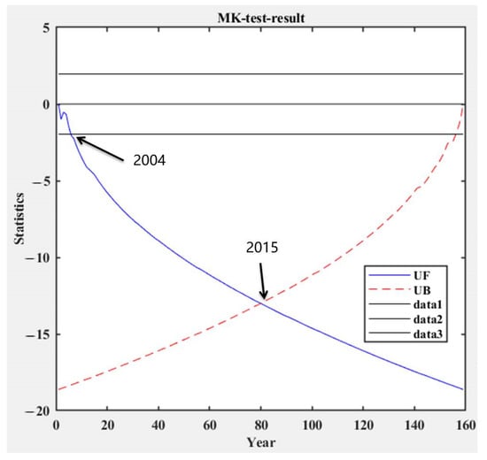 The time-series results of the ENVISAT ASAR, GPS, and Sentinel-1A/1B data are shown in Figure 7. ENVISAT ASAR and Sentinel-1A/1B satellites have different incident Angles, spatial resolutions, and selected reference points. To address the problem of different reference points, we selected the same coordinate reference points during the SBAS-InSAR process. The ENVISAT ASAR and Sentinel-1A/1B data had incident angles of 22.8° and 33.9°, respectively. The deformation results obtained from the ENVISAT ASAR and Sentinel-1A/1B data were mainly vertical. Therefore, directly projecting the LOS deformation results obtained from ENVISAT ASAR and Sentinel-1A/1B data in the vertical direction was appropriate. Moreover, we resampled the deformation results obtained from the two datasets to 30m to ensure consistency of their spatial resolution. In this study, the time-series of the two feature points P3 (Figure 8a) and P5 (Figure 8b) were selected for calibration. Due to the fact that the ENVISAT satellite stopped operating around 2012 and the Sentinel satellite began operating in 2014, there is no temporal overlap between the two satellites. It was impossible to directly calibrate the time series deformation results obtained from ENVISAT ASAR and sentinel-1a/1b data. Therefore, we used GPS data and a polynomial fitting algorithm to calibrate the deformation results. The time-series deformations of the ENVISAT, Sentinel-1A/1B, and GPS data were referenced to the same position, and corrected and offset temporally. For the time-series deformation results obtained from InSAR, we selected deformation points within 100 m of the GPS monitoring points. ENVISAT ASAR and Sentinel-1A/1B data acquired on 10 December 2003 and 24 January 2015, respectively, were used as temporal data. Both had different temporal datum for obtaining deformation results; therefore, the temporal datum of ENVISAT ASAR and Sentinel-1A/1B had to be unified. The GPS data used for calibration were based on the image from 17 October 2009. Thus, long time-series deformation was acquired (as shown in Figure 8a,b) after rectifying the deformation results from 2003 to 2010 and 2015 to 2020. In the same time period, we found that, although the InSAR observation method is not strictly registered in time with GPS, its deformation trend was consistent. However, the time series was not continuous. To acquire the missing data from 2010 to 2015, we adopted quadratic polynomial fitting interpolation and a mean algorithm. The resultant deformation results for the long time-series are shown in Figure 8c,d. We used continuous GPS time series results to analyze the obtained results. It was found that the deformation trend of this result was consistent with GPS. In addition, the calibrated long time-series was consistent with the three deformation stages of land subsidence evolution in Beijing. This was mainly demonstrated through rapid land subsidence after the over-exploitation of groundwater in Beijing. As the South-to-North Water Transfer Project was implemented at the end of 2014, the rate of land subsidence gradually decreased, and gradually became stable. The maximum accumulative deformation amount at P5 reached −1368 mm. In addition, on comparing GPS deformation results from 2009 to 2020 with those of ENVISAT and Sentinel-1A/1B fused data, the temporal sequence results after supplementing were found to be consistent with GPS trends through visual interpretation. By observing the data supplemented by the quadratic polynomial fitting method and the mean value algorithm, the inflection point of land subsidence in Beijing was found to be located in the corresponding time span of the supplemented data. Quantitatively, the inflection point occurred around 2015. The result obtained by the Mann-Kendall method was consistent with the analysis results (Figure 9). The extent and magnitude of land subsidence are related to geological structures [54,55,56]. Since geological structural changes occur over a certain time period, the magnitude of land subsidence does not change quickly. However, the rate of land subsidence can change with changes in groundwater [57,58]. The South-to-North Water Transfer Project significantly reduced the amount of groundwater exploitation. Thus, based on the analysis of the actual scenarios, the inflection point could have occurred due to the implementation of this project, which slowed the deformation rate of land subsidence to a certain extent.