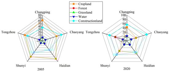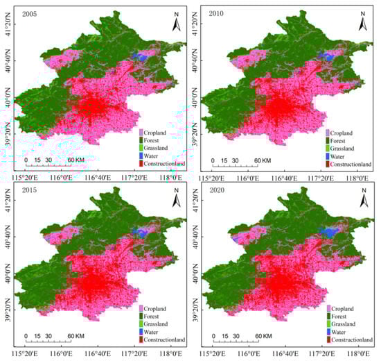 With rapid urbanization, the proportion of construction land in Beijing is gradually increasing, whereas that of cropland is decreasing. To analyze the changes in land use types in Beijing over a long period of time we acquired the distribution data of land use types in Beijing from 2005 to 2020 over a five-year interval, and used ArcGIS software to perform simple operations, such as reclassification and superposition analysis. Figure 10 shows the land use types in Beijing from 2005 to 2020.