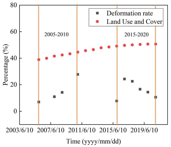 Land subsidence is a slow time-dependent subsidence process, which may have a slow and correlated response to land use and cover [59,60]. In order to explore the relationship between surface deformation and land use types in Beijing, we used previously obtained information of surface deformation rate from 2003 to 2020 to explore the evolutionary relationship between surface deformation and land use types in Beijing, based on land cover data.