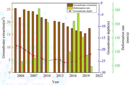 According to previous studies, land subsidence and groundwater in Beijing are closely related [63]. We obtained groundwater depth and exploitation data from 2003 to 2020 from the Beijing Water Resources Bulletin [64], provided by the Beijing Water Authority. The corresponding land subsidence results were also analyzed. The results are shown in Figure 13.