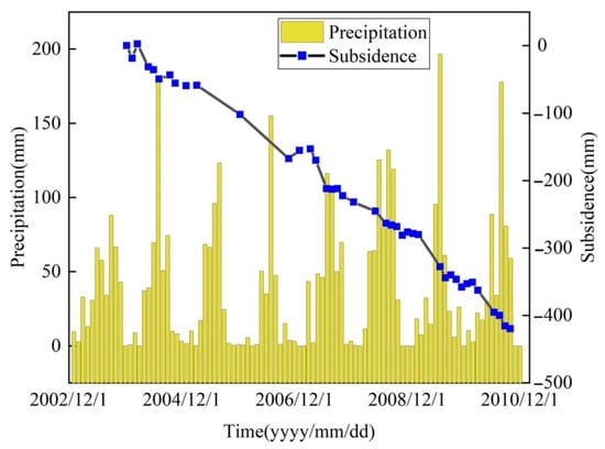 Figure 14 shows monthly precipitation deformation during the study period. In Figure 14, it can be observed that rainfall is mainly concentrated in the summer months of May-August, and the rainfall in summer is higher than that in other seasons. On this basis, we combined surface deformation with rainfall trends and analyzed the relationship between them. During the concentrated rainfall period, there is an obvious rebound deformation phenomenon along the LOS direction. We discovered that higher rainfall from May to August 2006 reduced the need to use groundwater for farm irrigation, and, thus, land subsidence rate showed a gradually slowing trend from October 2006 to March of the following year. Meanwhile, rainfall in autumn and winter of the same year decreased, so that land subsidence in the spring of the following year showed intensification. This indicates that peoples’ demand for groundwater decreases after rainfall, which slows down land subsidence to a certain extent. Ground settlement is negatively correlated with precipitation.