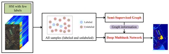 Based on the above, a graph-based deep multitask few-shot learning (GDMFSL) framework was proposed to deal with HSI classification with few labels, which is shown in Figure 1. Obviously, the first step of GDMFSL was to construct a semi-supervised graph on the basis of all of the samples, both labeled and unlabeled. Meanwhile, graph information was generated to prepare for deep multitask network. The second step was for the deep multitask network to learn and train under the supervision of few labels and graph information, where the input contains all samples. Finally, unlabeled samples were fed into deep multitask network to predict classes.
