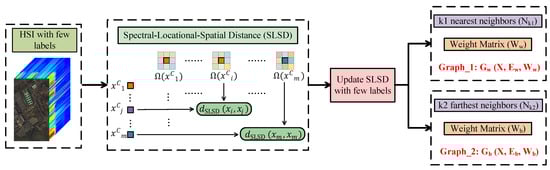 The key to constructing a graph is how to effectively calculate the similarity between samples. For this purpose, the spectral–locational–spatial distance (SLSD) [] method was employed, which combines spectral, locational and spatial information to excavate the more realistic relationships among samples as much as possible. SLSD not only extracts local spatial neighborhood information but also explores global spatial relations in HSI-based location information. Experimental results in [] show that neighbor samples obtained by SLSD are more likely to fall into the same class as target samples.